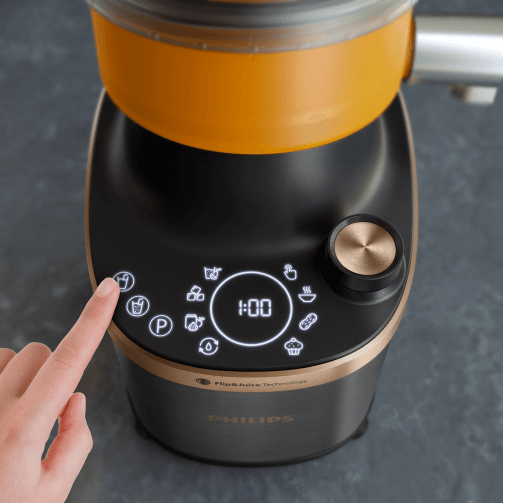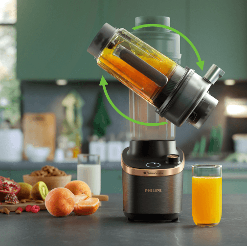 Новий блендер Philips Flip&Juice™ із чашею революційної конструкції та модулем центрифужної соковижималки з ситом дозволяє отримувати як чисті соки та соки з м’якоттю, так і готувати смузі із шовковистою текстурою і горіхову пасту. Зробіть свою родину щасливою завдяки широкому різноманіттю текстур напоїв і страв у меню.