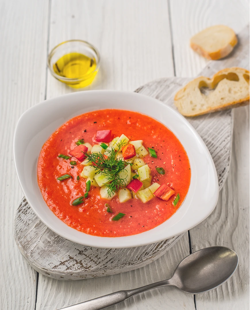 За лічені секунди можна приготувати томатний гаспачо з перцем і часником або огірковий суп із м’ятою.
