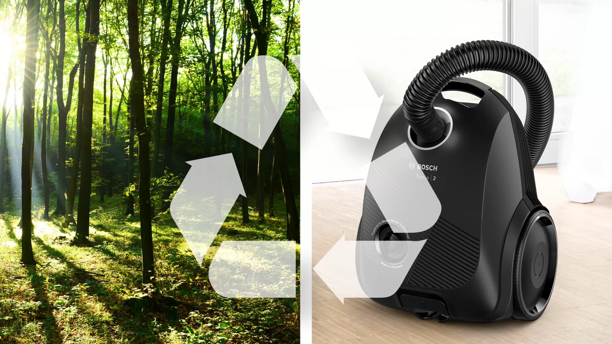 Bosch прагне екологічності, саме тому прилади Bosch розроблені для збереження навколишнього середовища. Пилосос виготовлений з 64% переробленого пластику, тоді як упаковка може бути перероблена на 100%.Завдяки довговічному двигуну Bosch ви будете насолоджуватися пилососом тривалий час.