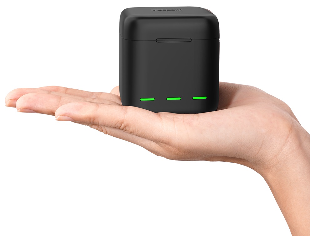 Зарядний пристрій виконаний у формі боксу з кришкою на магніті, що дуже зручно для зберігання і транспортування, а також зарядки в дорозі. Усередині передбачені місця для зберігання карт пам'яті.