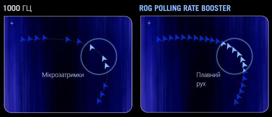 ROG Polling Rate Booster передає дані від бездротової клавіатури або миші до вашого комп’ютера з більш високою частотою. Порівняно зі стандартною частотою опитування 1000 Гц, використання під час гри частоти опитування 4000 або 8000 Гц означає, що дані про рух миші або натискання клавіші клавіатури будуть значно точнішими, тобто затримки між вашою дією і реакцією екрані будуть мінімальними.