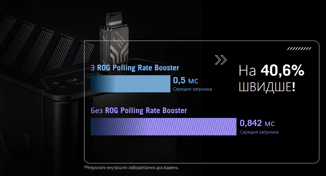 ROG Polling Rate Booster забезпечує справжню частоту опитування до 8000 Гц як у бездротовому, так і в дротовому режимах. Він ще більше підвищує якість бездротового з'єднання, коли працює в парі з технологією ROG SpeedNova, яка дає змогу отримати мінімальні в галузі значення затримки передачі сигналу.