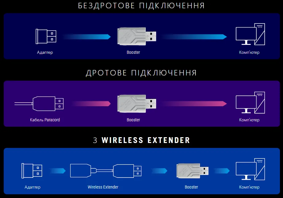 У зв’язку з високою інтенсивністю обміну даними, ROG Polling Rate Booster демонструє оптимальні результати, коли він розташований на відстані до 60 см від бездротового пристрою і за відстутності перешкод. Ексклюзивний дизайн ROG дозволяє використовувати Booster з будь-яким комп'ютером.