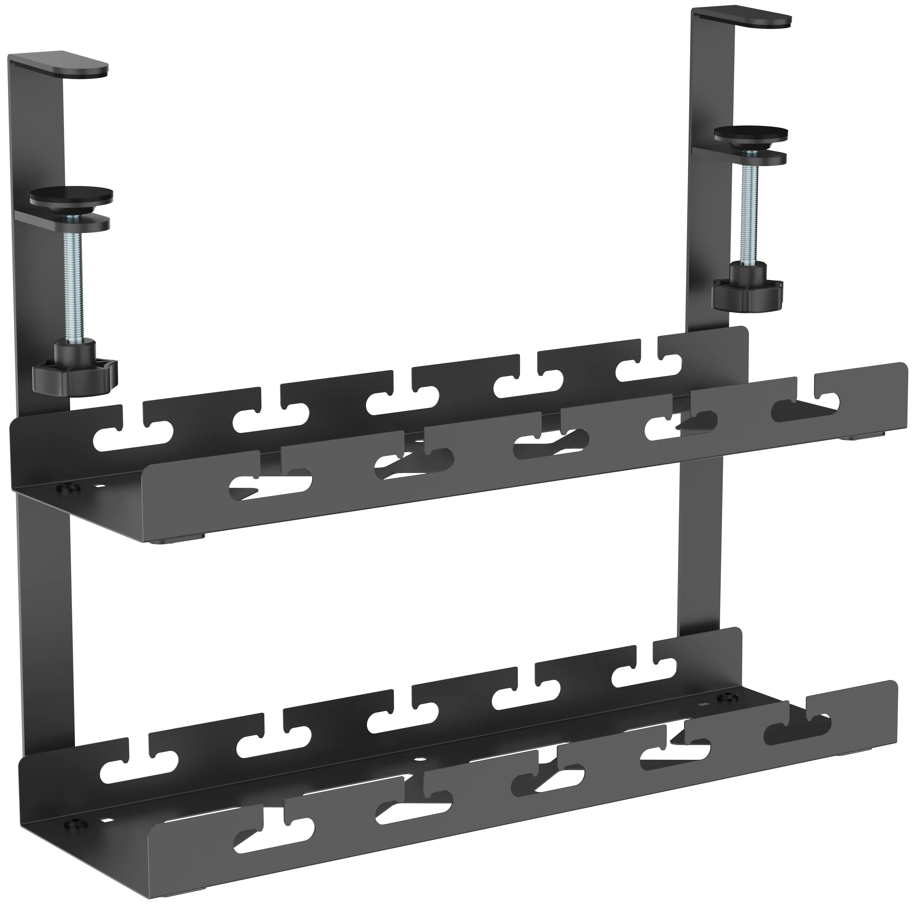 Дві полиці забезпечують більше місця для зберігання та підходить для різних розмірів столів і потреб у зберіганні. Легко встановлюється за допомогою міцних затискачів та може вміщати кабелі, хаби, подовжувачі і адаптери живлення.