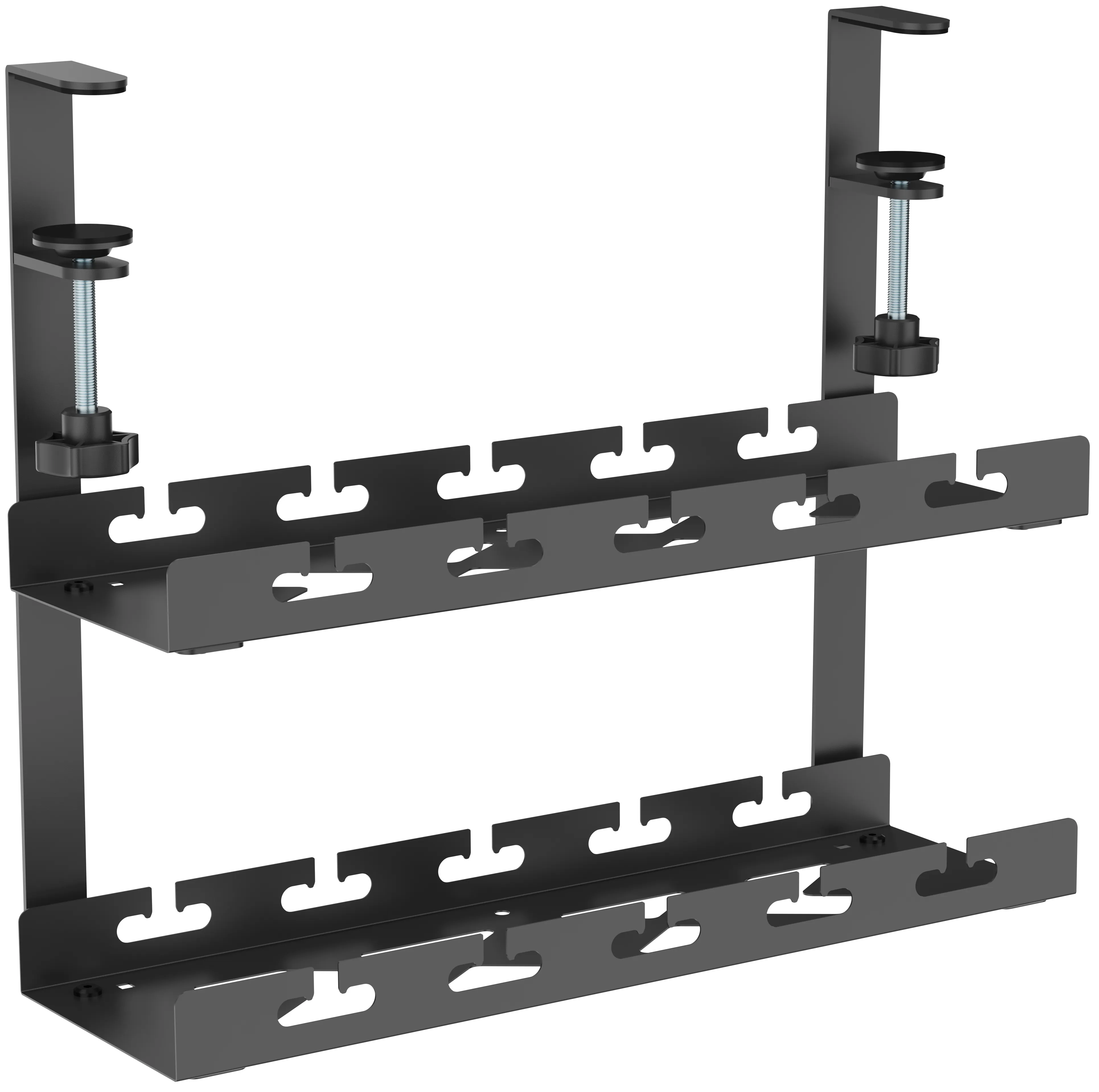 Дві полиці забезпечують більше місця для зберігання та підходить для різних розмірів столів і потреб у зберіганні. Легко встановлюється за допомогою міцних затискачів та може вміщати кабелі, хаби, подовжувачі і адаптери живлення.