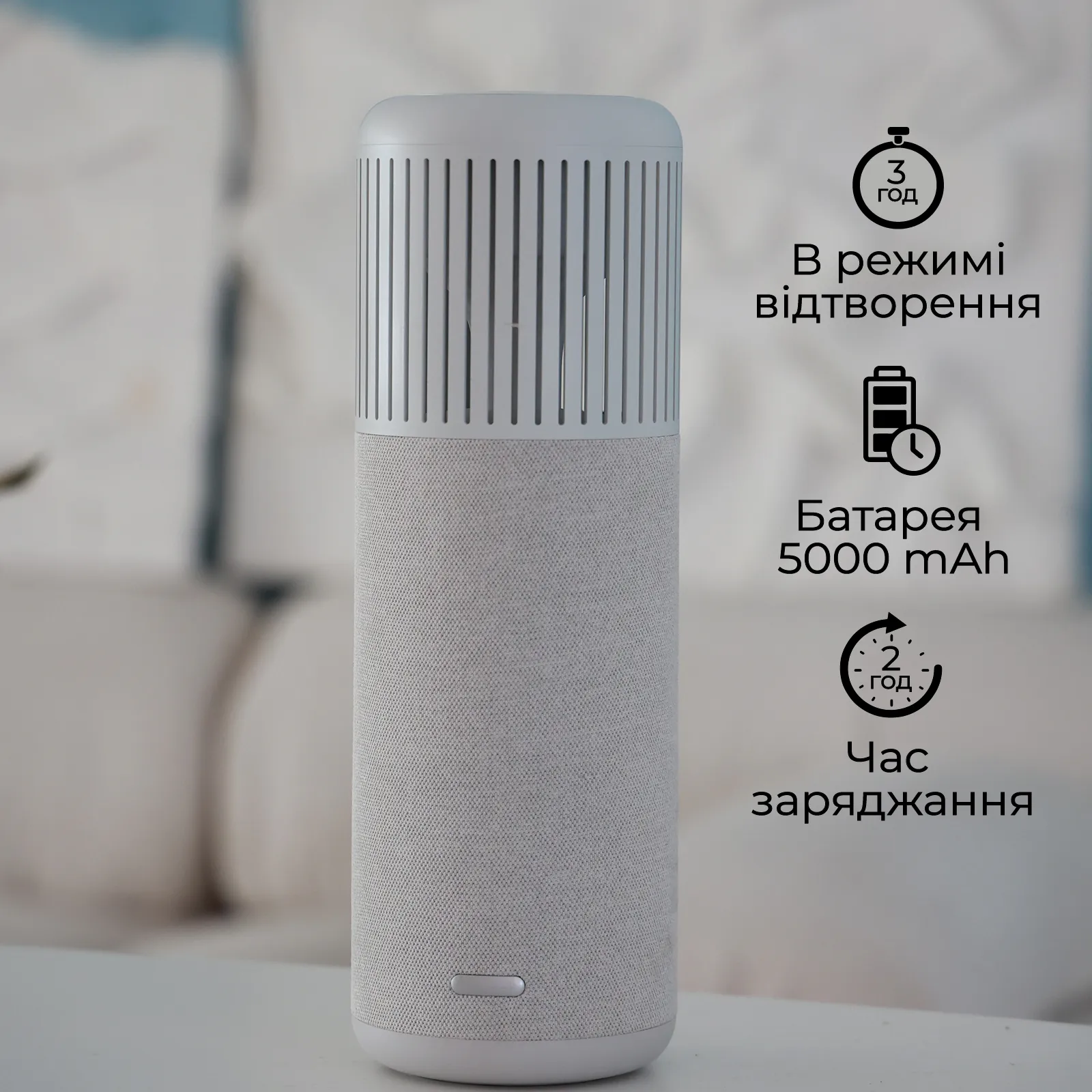 До 3 годин у режимі музики, або 2 години у режимі музики та світла. Повністю заряджається за 2 години комплектним адаптером.