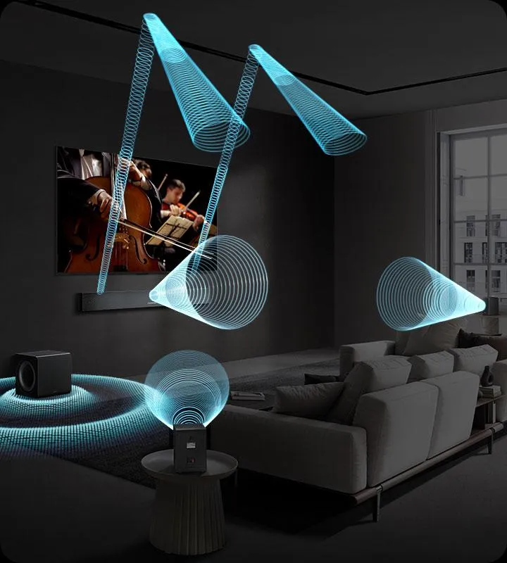 Цей саундбар створений для тих, хто цінує якісний об'ємний звук у будь-якому просторі. Завдяки вбудованому гіроскопічному датчику пристрій автоматично визначає своє положення - на стіні або на столі - і оптимізує звучання для ідеального сприйняття. Підтримка Dolby Atmos забезпечує справжню 3D-аудіо картину, створюючи ефект повного занурення, як у кінотеатрі. Багатопозиційна установка і динаміки, спрямовані вгору, адаптуються під ваш інтер'єр, роблячи саундбар універсальним рішенням для будь-якої кімнати.