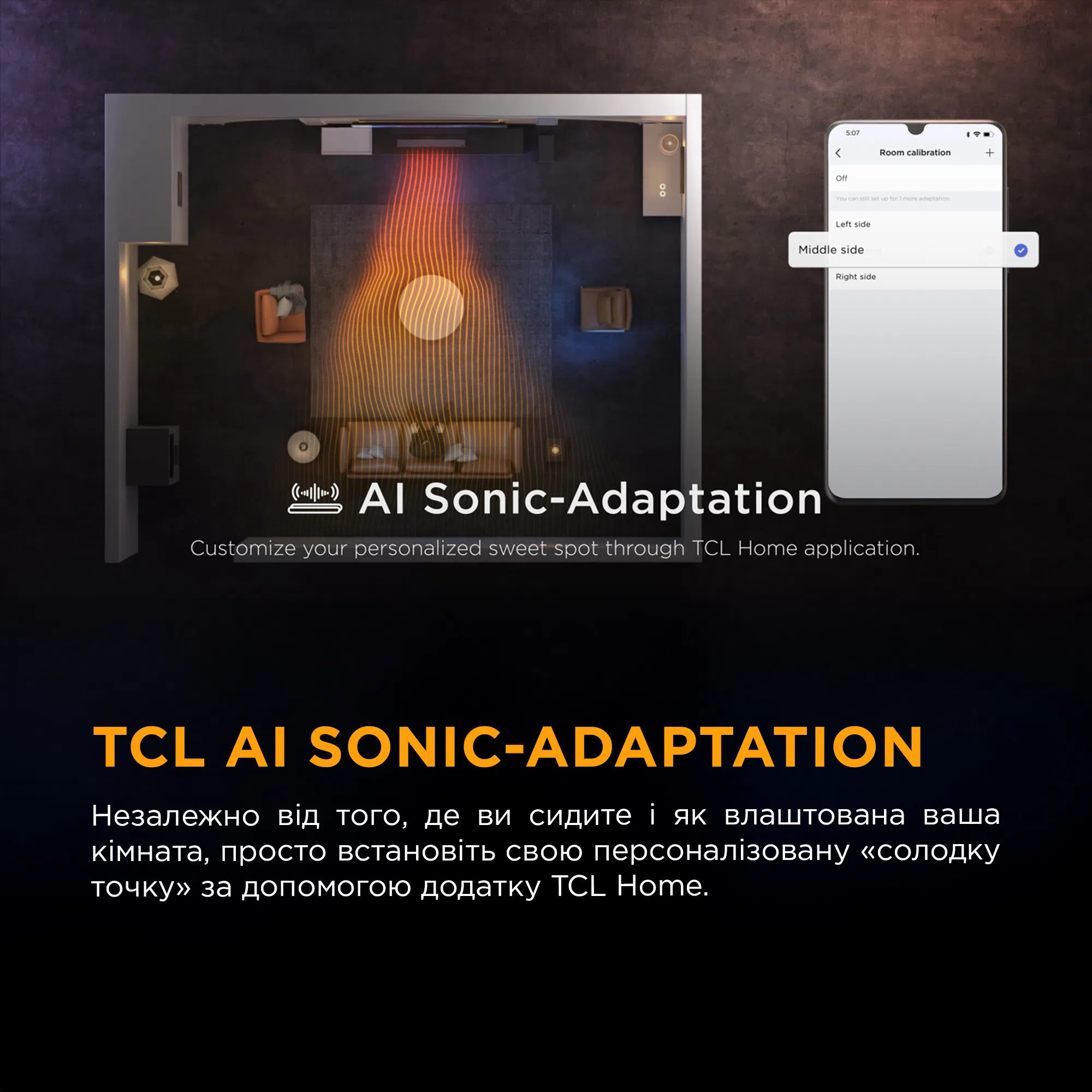 Обирайте будь-яке місце перед екраном, насолоджуючись незмінно якісним, збалансованим та чистим звучанням завдяки технології TCL AI Sonic-Adaptation. Просто вкажіть ваше положення в додатку TCL Home на смартфоні, для точно спрямованого гармонійного аудіо, адаптованого для кожного простору.