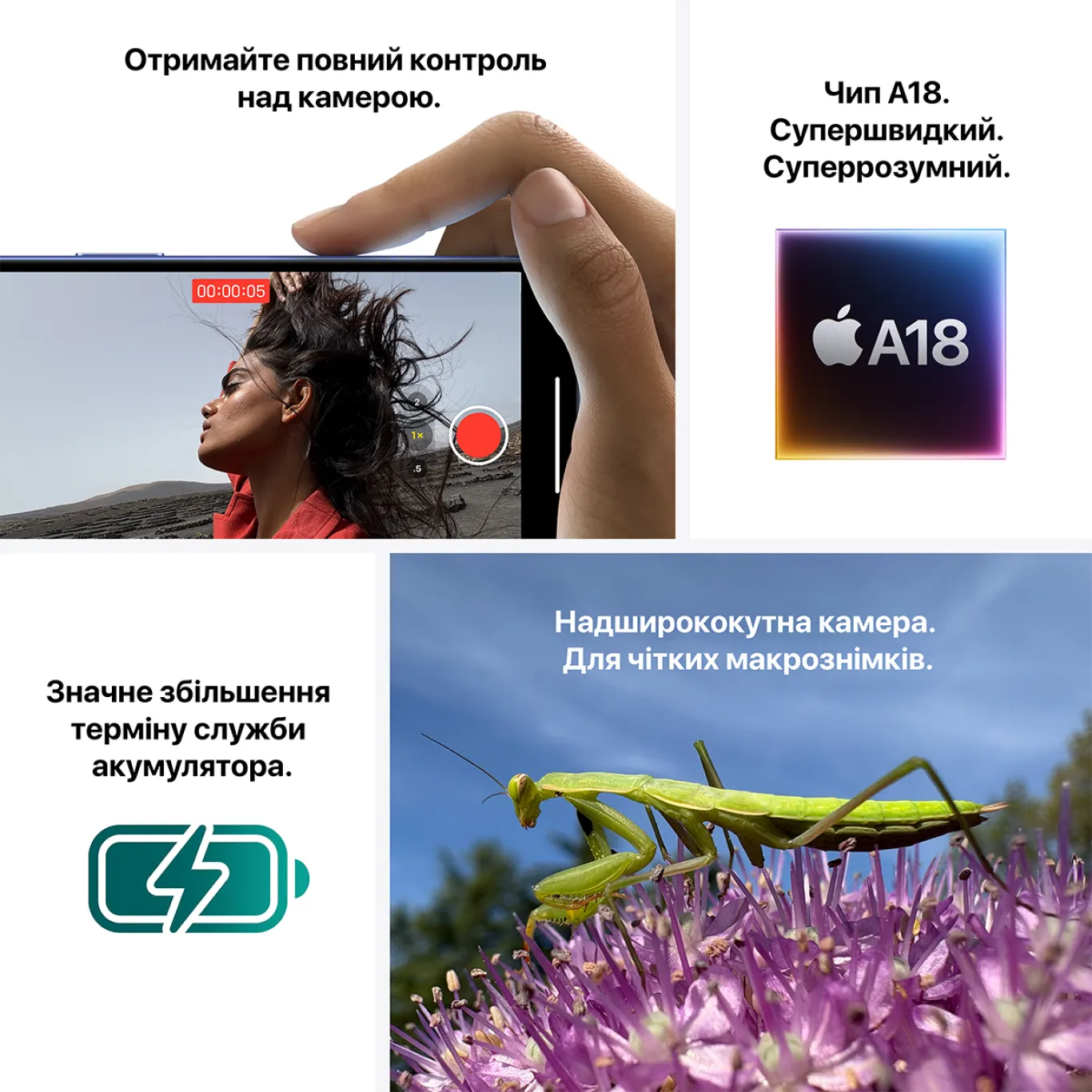 iPhone 16 разом із чипом A18 забезпечують значно триваліший час роботи від акумулятора та до 22 годин відтворення відео. Заряджайте через порт USB-C або просто підключіть зарядний пристрій MagSafe для швидшого бездротового заряджання.