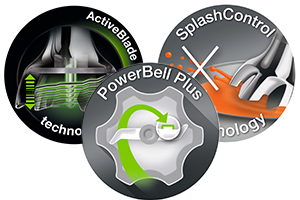 Безумовним плюсом приладу є простота і швидкість зміни насадок. Вони від’єднуються від моторного блоку одним легким рухом та надійно фіксуються спеціальним замком на весь час роботи. Нога виготовлена з міцного легкого металу за технологією PowerBell Plus та системою SplashControl. Розширення у вигляді невеликого «дзвону» в нижній частині запобігає розліту частинок продуктів, коли ви обробляєте інгредієнти у відкритому посуді. Посилені рухливі ножі ActiveBlade, здійснюють вертикальні рухи, на 40% знижуючи необхідні зусилля, які вам потрібно прикладати підчас обробки.