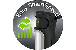 Даний блендер має цілком стандартні показники потужності 1000 Вт, але власну, унікальну систему контролю швидкісних режимів. Обертання насадки прискорюється, якщо ви сильніше стискаєте перемикач, розташований на рукоятці і, відповідно, знижується, коли натискання слабшає. Подібна схема використовується в блендерах Braun вже давно і добре себе зарекомендувала, завдяки високій точності, якої дозволяє досягти.