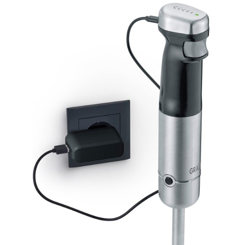Бездротовий ручний блендер Graef важить лише 890 г (включаючи акумулятор), тому його легко тримати в руці. А завдяки ергономічному корпусу з нержавіючої сталі та пластику робота з ним не викликає втоми.
