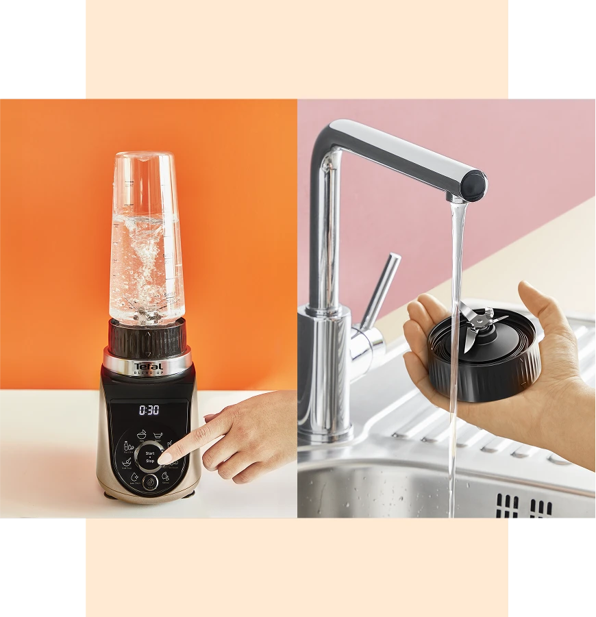 Для очищення блендера просто наповніть чашу водою, додайте краплю мильного засобу і увімкніть функцію самоочищення.