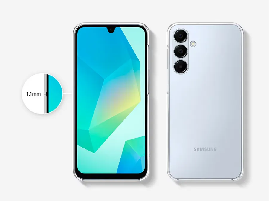 Samsung A16 Clear Case з товщиною всього 1,1 мм — найтонший із чохлів Samsung, який ідеально облягає смартфон, зберігаючи його витончений силует. А його гладка глянсова поверхня надає пристрою стильного, мінімалістичного вигляду, підкреслюючи його сучасний дизайн.