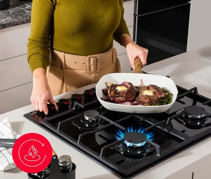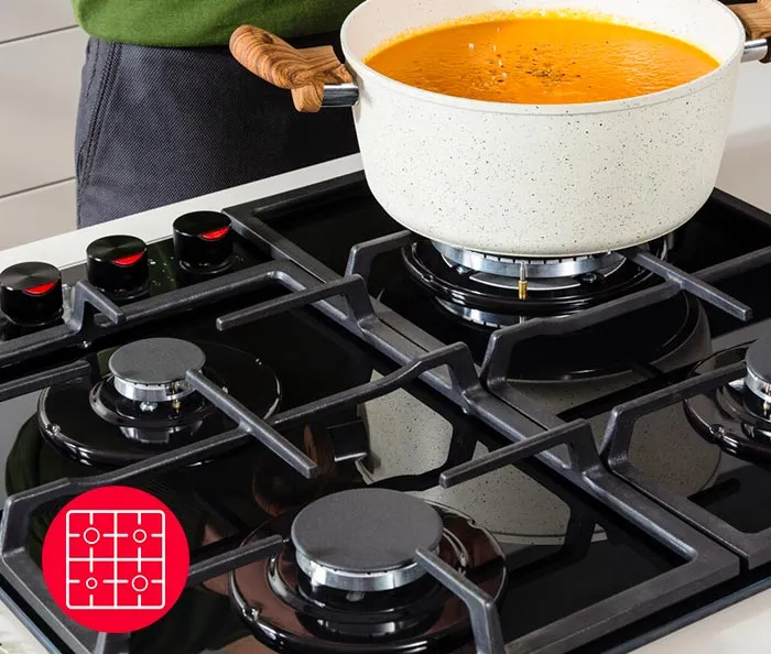 У цій варильній поверхні кожна деталь продумана та функціональна. Саме тому вона оснащена функціями автоматичного розпалювання і газ-контролю. Так, авторозпал дає змогу вмикати будь-яку конфорку одним рухом – натиснув, повернув, готуєш. А вбудований газ-контроль автоматично перекриє подачу газу, якщо полум'я згасне, що допоможе уникнути витоків і небезпечних ситуацій. Усе просто, безпечно та зручно.