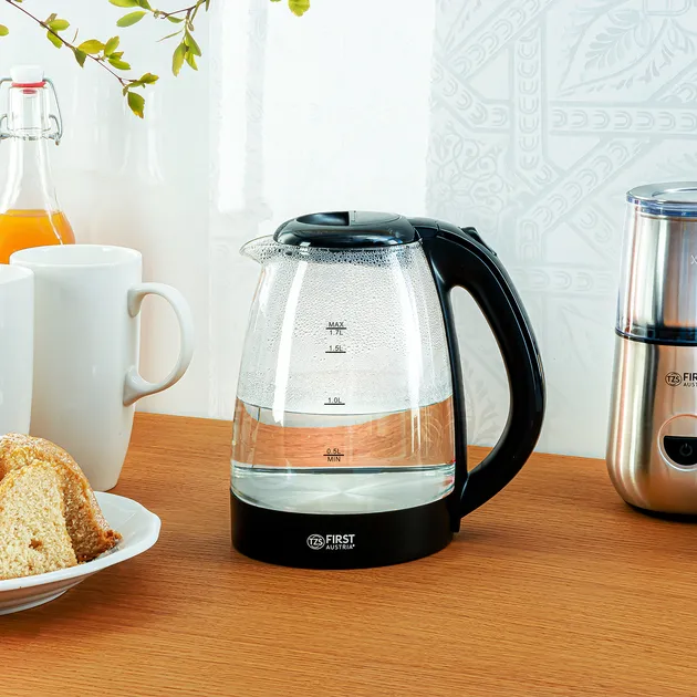 Основний колір чайника - чорний, що робить його універсальним і відповідним для будь-якого інтер'єру. Розміри пристрою становлять 23 х 21 х 15 см, а вага - всього 0,8 кг, що робить його компактним і легким для переміщення.Електрочайник FIRST FA-5404-1 - це не просто побутовий прилад, а стильний аксесуар для вашої кухні. Скляний корпус дає змогу спостерігати за процесом кип'ятіння води, що додає елемент інтерактивності та естетичного задоволення. Крім того, скло є екологічно чистим матеріалом, що не виділяє шкідливих речовин під час нагрівання.