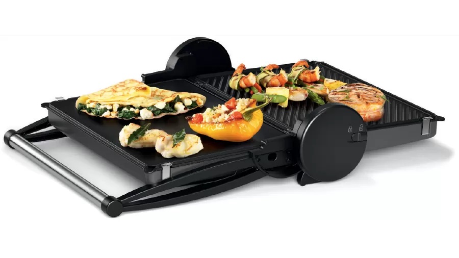 Регулювання температури з інтегрованою функцією ввімкнення/вимкнення; Оснащений двома окремими регуляторами температури для верхньої та нижньої пластини; Багатофункціональний: нагрівання знизу та зверху для контактного грилю/обсмажування тільки однієї поверхні,запікання та підтримання страв у теплому стані; Аксесуар в комплекті: форма для запікання; Велика поверхня для смаження: 328 x 238 мм; Індикатор температури