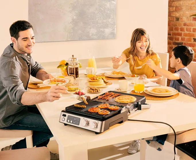 Від стейків, риби, овочів до кесадильї, паніні, млинців, яєць або вафель – цей гриль може все. Три комплекти пластин з антипригарним покриттям — гриль, пласка та для вафель — дозволяють готувати будь-яку страву, залежно від ваших кулінарних уподобань.