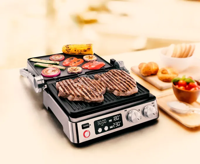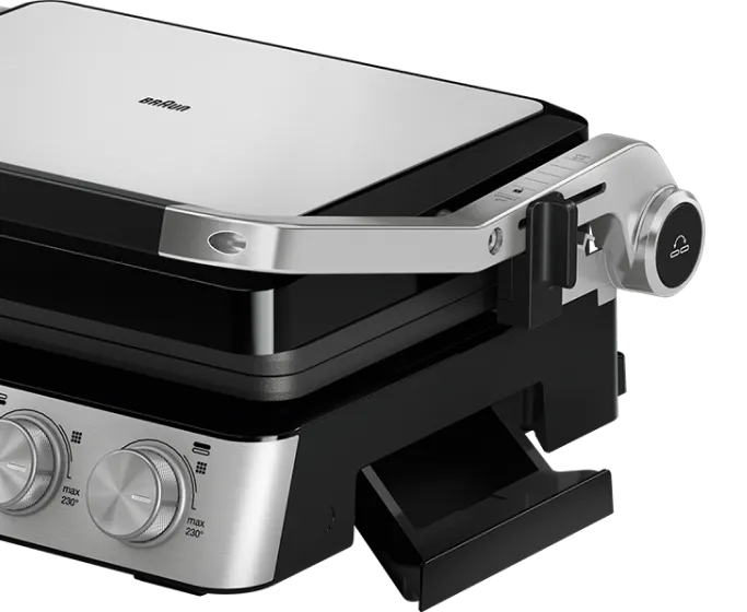 Незалежні зони нагріву; Відкриття на 180 °; Пластини можна мити в посудомийній машині; Регулювання положення пластин; Регульовані задні ніжки; Світлодіодна підсвітка