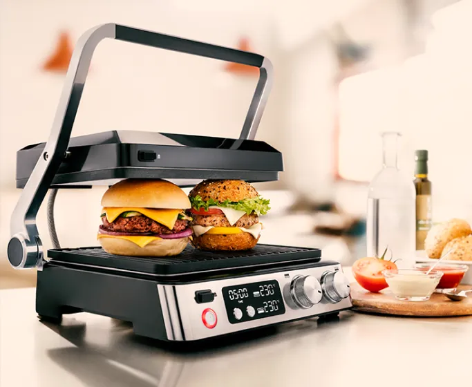 Надзвичайна точність і чудова універсальність у вас під рукою. Два незалежних електронних регулятора дозволяють точно встановлювати температуру кожної пластини окремо, щоб ви могли одночасно готувати дві страви на двох температурах.