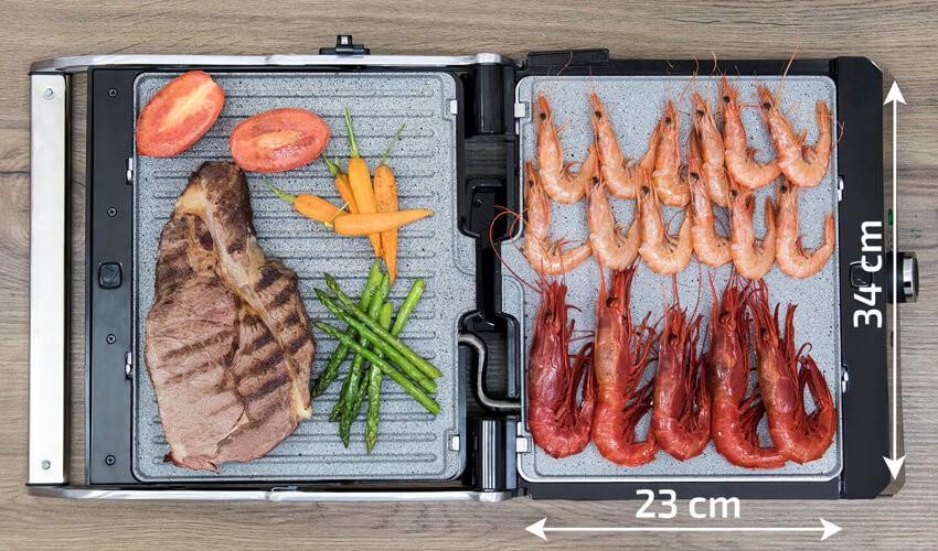 Поки готуються одні продукти, інші можуть охолонути і стати вже не такими смачними. З поверхнею 34 x 23 см можна готувати кілька страв одночасно: м'ясо, овочі та інші інгредієнти. Гриль можна розгорнути та готувати відразу на обох пластинах.