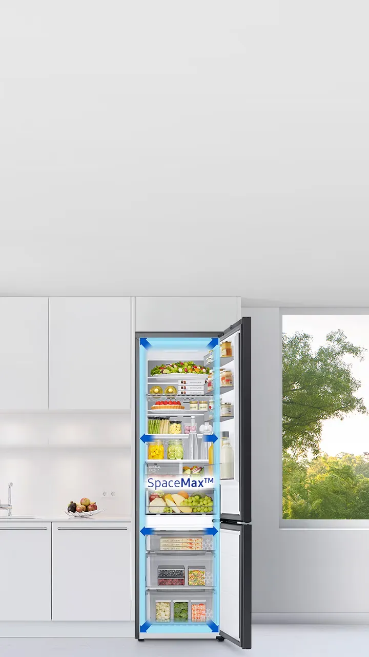 Зберігайте більше продуктів у великому холодильнику об’ємом 385 літрів* із глибиною 600 мм. Унікальна технологія SpaceMax™ використовує спеціальну високоуретанову ізоляцію, яка дозволяє зробити стінки набагато тоншими не погіршуючи при цьому енергоефективність. Таким чином, всередині стає більше простору.