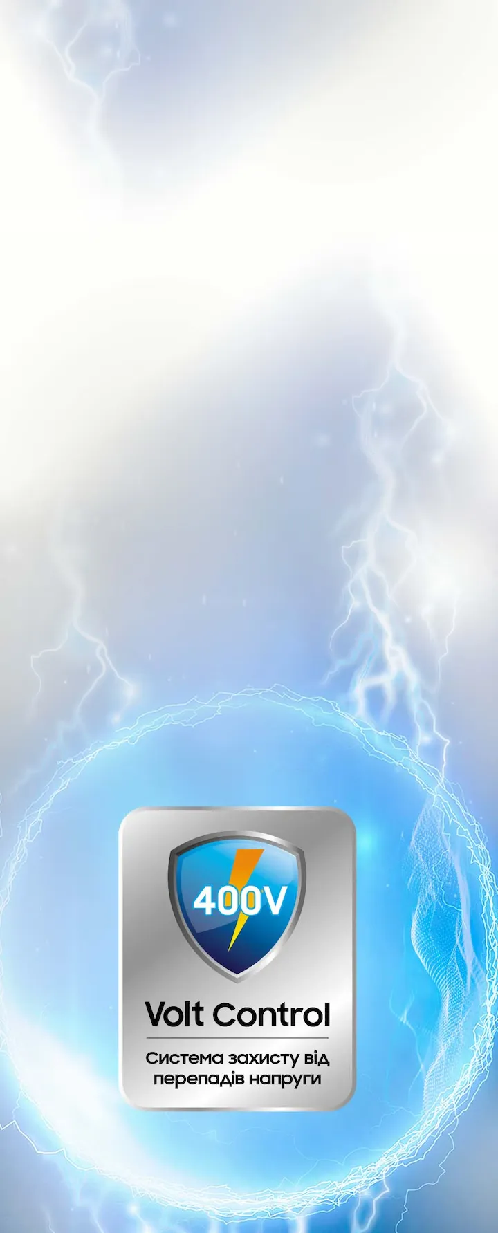 Технологія Volt Control забезпечує стабільну роботу побутової техніки* при коливаннях напруги в діапазоні від 187 до 253 В. При значних стрибках напруги до 400 В технологія Volt Control автоматично вимикає прилади, захищаючи їх від можливих пошкоджень. Після стабілізації напруги техніка автоматично відновлює роботу із тієї стадії, на якій вона вимкнулася. Volt Control надійно захищає вашу пральну машину, холодильник або духову шафу, забезпечуючи їхню довговічність і безперебійну роботу.