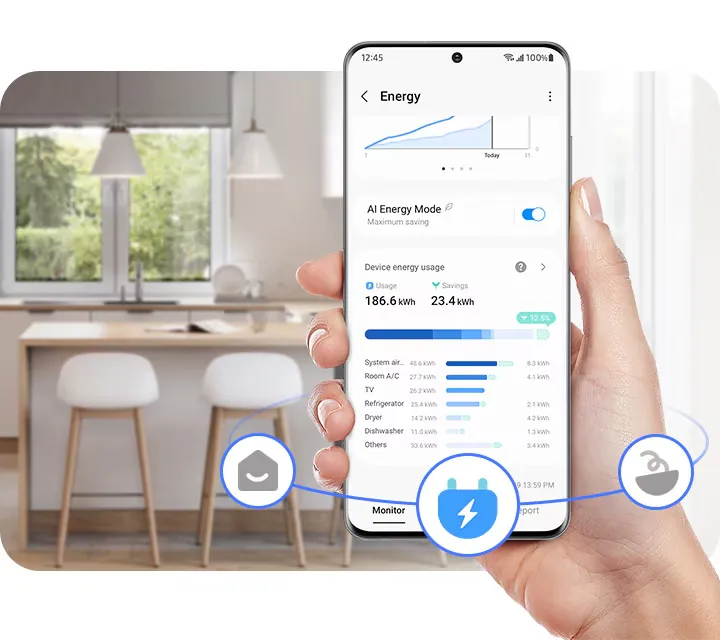 * Доступно на окремих моделях з травня 2023 року з оновленням по Wi-Fi. Результати тестів базуються на порівнянні заводських налаштувань температури з використанням режиму AI Energy та без нього. Результати можуть відрізнятися залежно від умов та особливостей використання.** Доступно через застосунок SmartThings на пристроях Android та iOS. Потрібне підключення до мережі Wi-Fi та вхід до облікового запису Samsung.*** Орієнтовні рахунки створюються застосунком Smart Things і можуть відрізнятися від фактичних рахунків. Застосунок SmartThings покаже два варіанти, Максимальний режим і Режим користувача для активації режиму AI Energy.