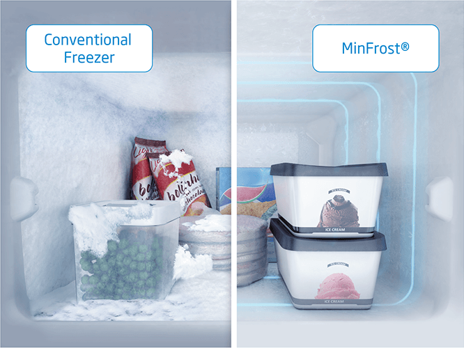 Через намерзання льоду продукти в холодильнику злипаються, а пристрій споживає більше електроенергії. Спеціальна система випаровування MinFrost® мінімізує обмерзання всередині холодильника. Це означає, що заморожені продукти зберігатимуться довше, споживатиметься менше електроенергії, а розморожувати холодильник знадобиться рідше.
