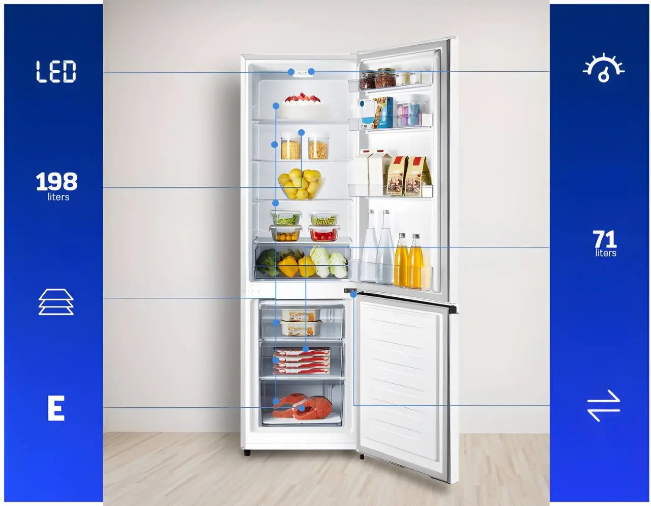 Це стильний і функціональний холодильник з двома камерами, що поєднує в собі елегантний дизайн і високу ефективність. Зовнішній вигляд моделі привертає увагу своєю сучасною формою та вишуканими деталями. Ви насолоджуєтеся оптимальним енергоспоживанням і надзвичайною економією, холодильник зменшує вплив на навколишнє середовище. Холодильник оснащений трьома скляними полицями, які дають змогу зручно розміщувати продукти різного розміру. Також є відділення для фруктів і овочів, що допомагає зберігати їх свіжими та смачними.