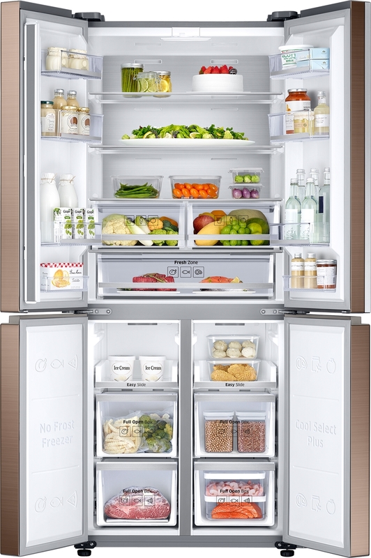 Зберігайте більше продуктів і легко знаходьте їх при необхідності. Холодильник Samsung RF50K5960DP має загальний корисний об'єм у 486 літрів, що дає можливість створювати значні запаси і рідше ходити в магазини. Усередині цього апарату цілком можна розмістити запаси на місяць для сім'ї з 4-5 чоловік. А четверо дверцят забезпечують відмінний огляд і швидкий доступ до всіх продуктів.