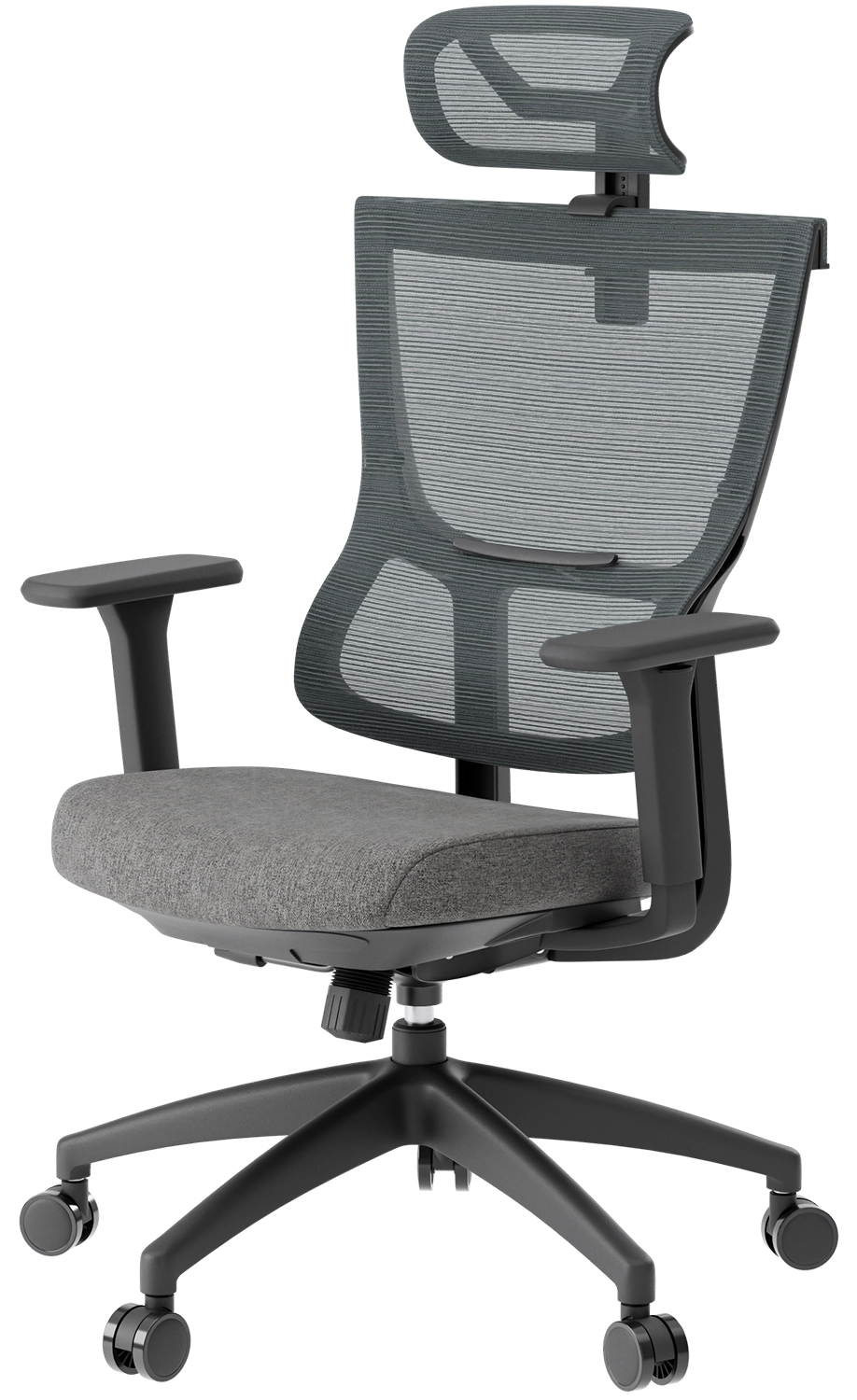Оббивка виконана з міцної сітки поліестеру, що забезпечує природну вентиляцію та комфорт протягом усього робочого дня. Матеріал корпусу — нейлон, відомий своєю стійкістю до зносу та навантажень. Таке поєднання гарантує довговічність і зручність навіть при щоденній експлуатації. Кольорове рішення — чорний і темно-сірий — надає кріслу елегантний, універсальний вигляд, який легко впишеться в ділову атмосферу сучасного офісу.