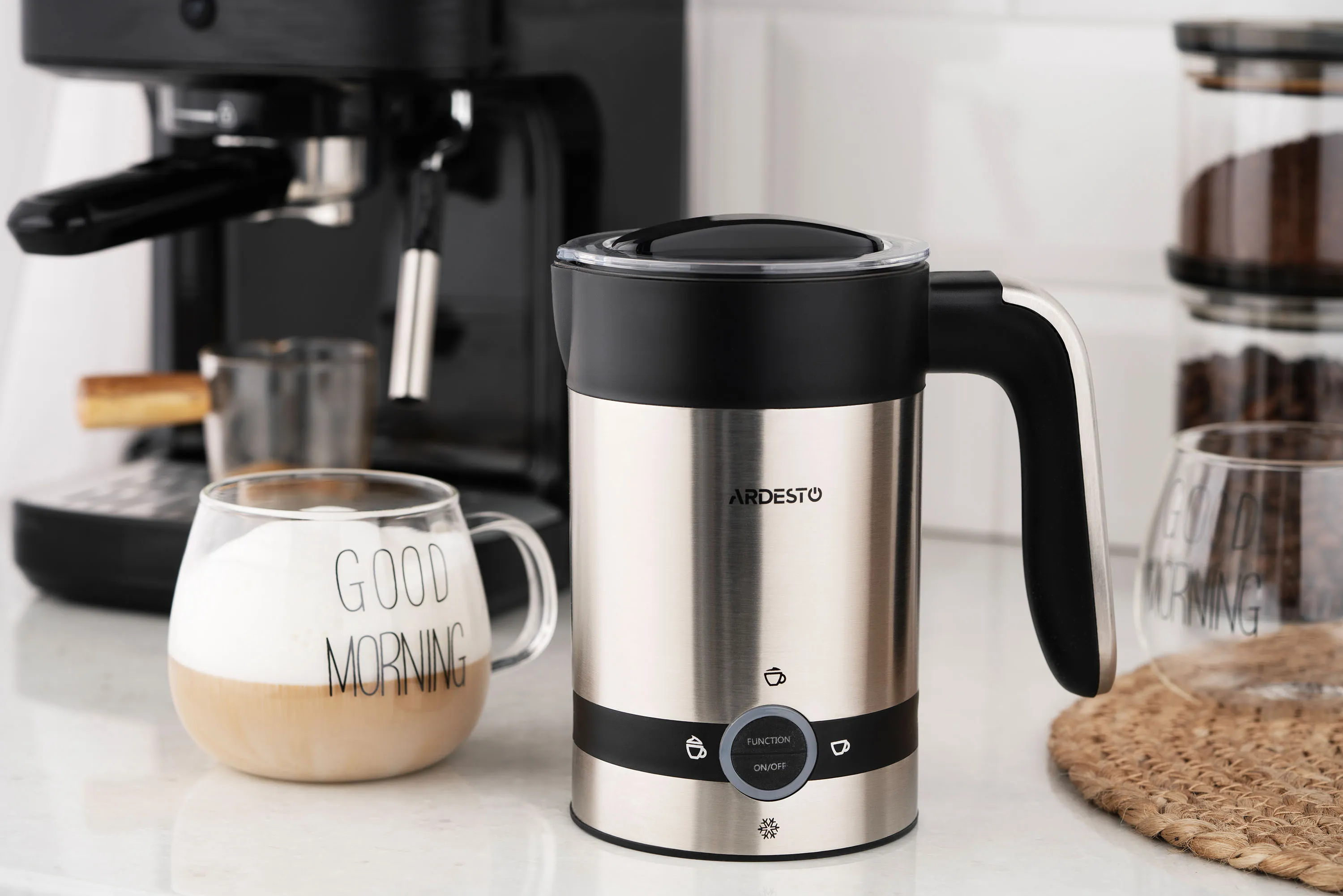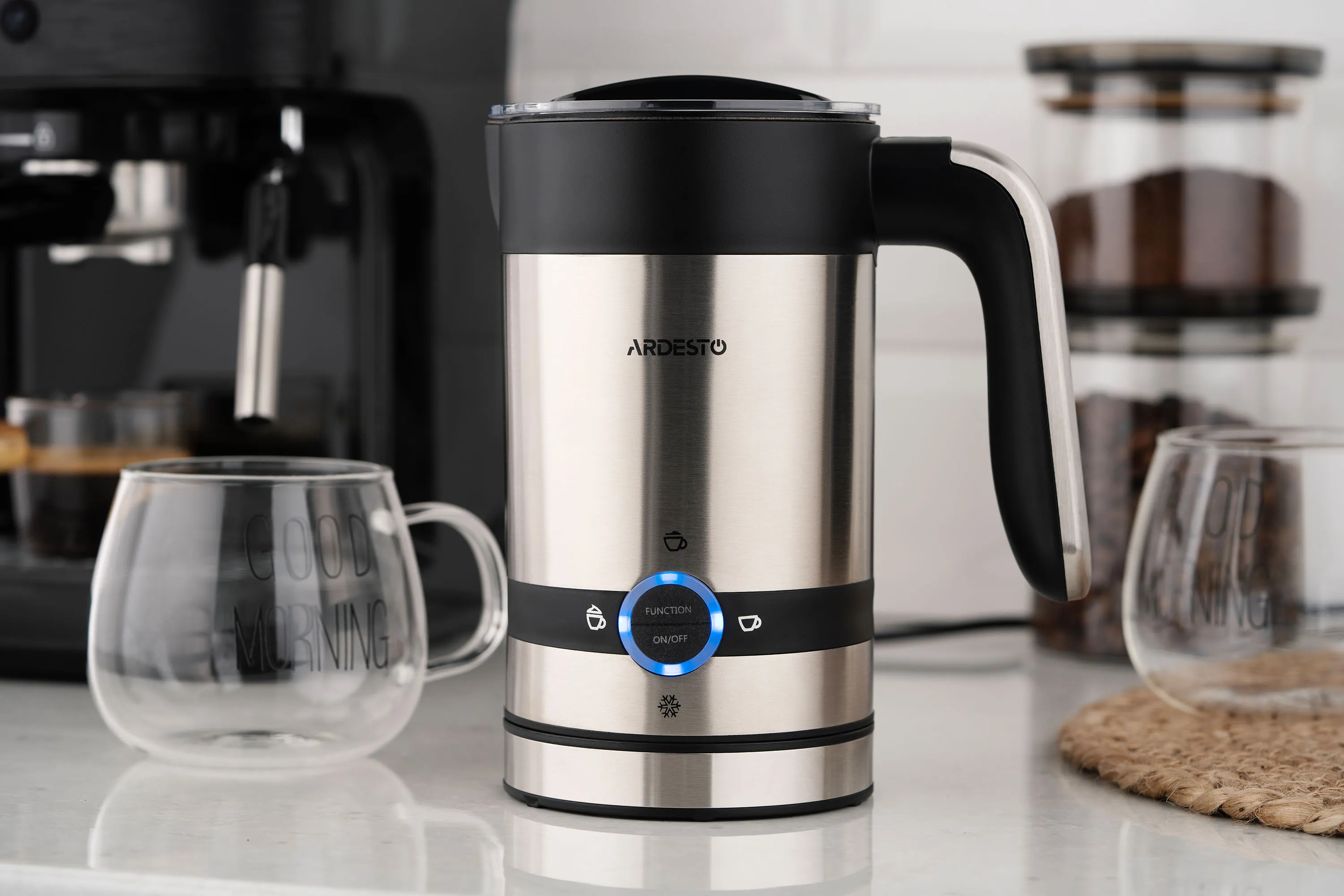 Пристрій сріблясто-чорного кольору вироблено з нержавіючої сталі, що надає йому сучасний вигляд і гарантує тривале слугування. Конструкцією передбачено систему обертання на підставці (360°), що робить спінювач надзвичайно зручним у використанні. Завдяки застосуванню магнітного привода забезпечено безшумну роботу. Інтегрований світлодіодний індикатор відображає стан пристрою та процесу збивання. Крім того, модель оснащено автоматичною системою вимкнення – безпеку використання гарантовано. Внутрішній резервуар, виготовлений із нержавіючої сталі, має протипригарне покриття, що робить очищення надзвичайно простим, а прозора кришка дає змогу контролювати процес збивання молока.