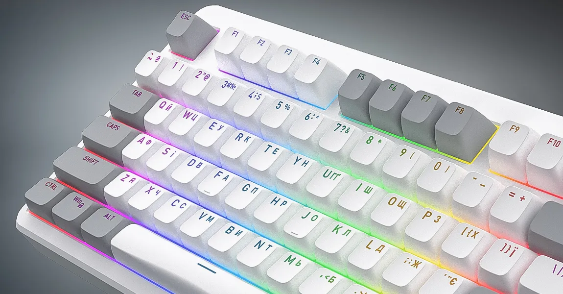 Зносостійкі PBT кейкапи з українськими літерами та яскравим підсвічуванням гарантують довговічність без вицвітання, а також чіткість підсвічених символів.