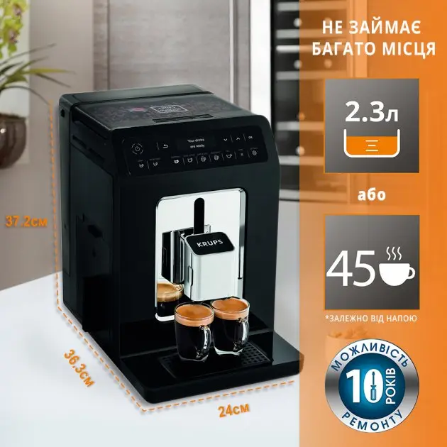 Незалежно від того, чи є ви шанувальником чорної кави або віддаєте перевагу напоям на основі молока, з цією кавомашиною ви обов'язково знайдете щось для себе. KRUPS Evidence може приготувати 15 різних видів кави. від класичного еспресо, невеликого ристретто чи доппіо до фірмових молочних капучино та латте макіато. А також просто нагріти води для чаю.