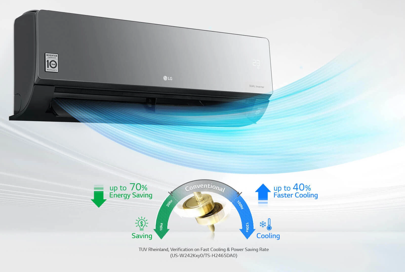 Інверторний компресор постійно регулює свою продуктивність, щоб підтримувати оптимальну температуру в приміщенні. Технологія DUAL Inverter дозволяє економити більше електроенергії, порівняно зі звичайним компресором.