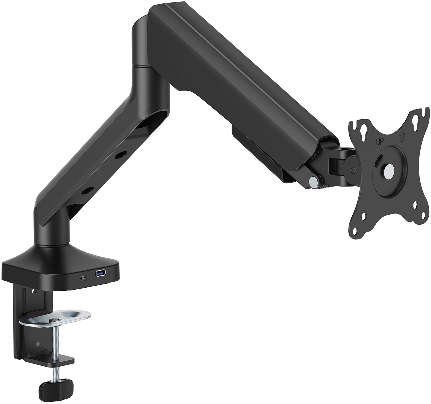 Officepro MA451B – це сучасне рішення для ефективного розміщення екрану, що поєднує функціональність, надійність і стильний дизайн. Підходить для плоских і вигнутих моніторів розміром від 17 до 40 дюймів і вагою від 2 до 12 кг. Ідеально підходить як для офісного, так і домашнього використання. Корпус виготовлений зі сталі, алюмінію і пластику. Регульована конструкція дозволяє нахиляти монітор в діапазоні ±90°, обертати на 180° і повертати вліво/вправо на 90°, забезпечуючи зручний кут огляду для будь-яких завдань. Кріплення підтримує стандарти VESA 75x75 і 100x100 мм. Монтаж можливий за допомогою струбцини або наскрізного кріплення, що дозволяє встановлювати пристрій на стільниці товщиною від 10 до 80 мм. Завдяки вбудованим портам USB 3.0 і Type-C ви отримаєте швидкий доступ до зарядки або передачі даних прямо на робочому місці. Органайзер для кабелів забезпечує акуратність і мінімалізм на столі. Це універсальне рішення для комфортної та ергономічної роботи на комп'ютері.