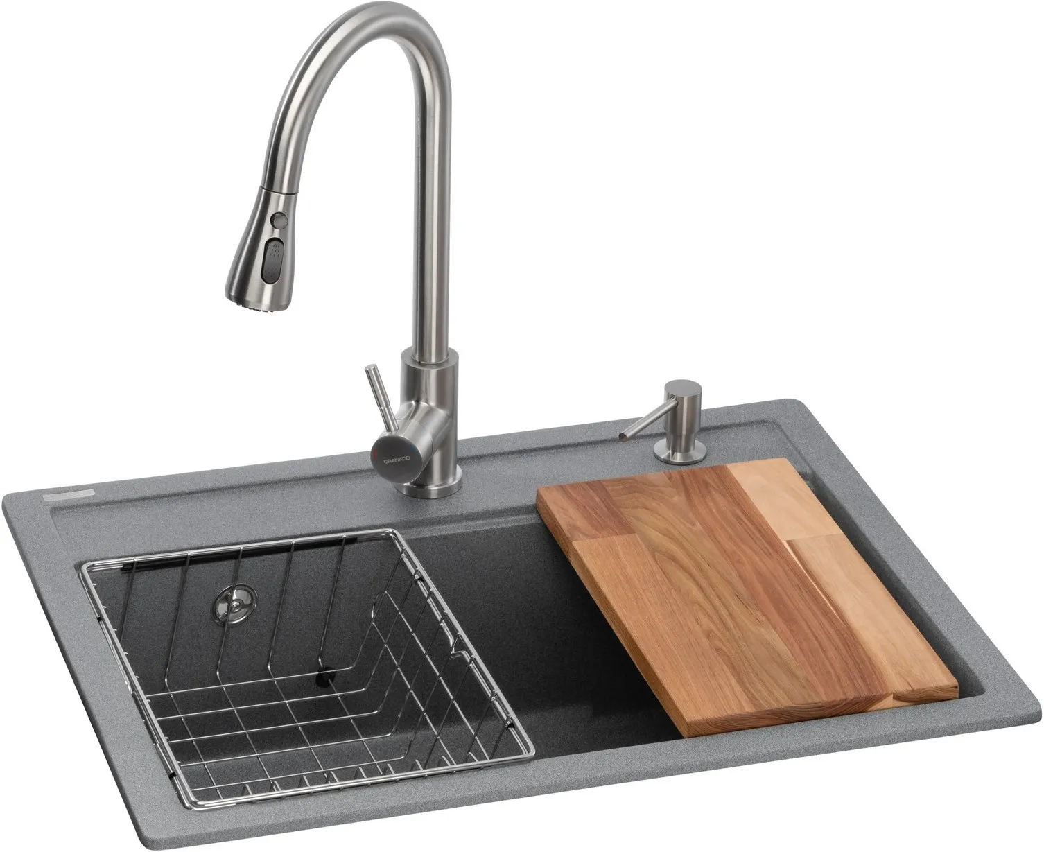 Кухонна станція GRANADO Basic Artes Grafito — це готовий набір, що поєднує стиль, практичність та довговічність. У комплект входять кварцова мийка, змішувач із висувним виливом, металевий кошик, дозатор для миючого засобу та дерев’яна обробна дошка. Все необхідне для зручного щоденного використання вже продумано фахівцями GRANADO.