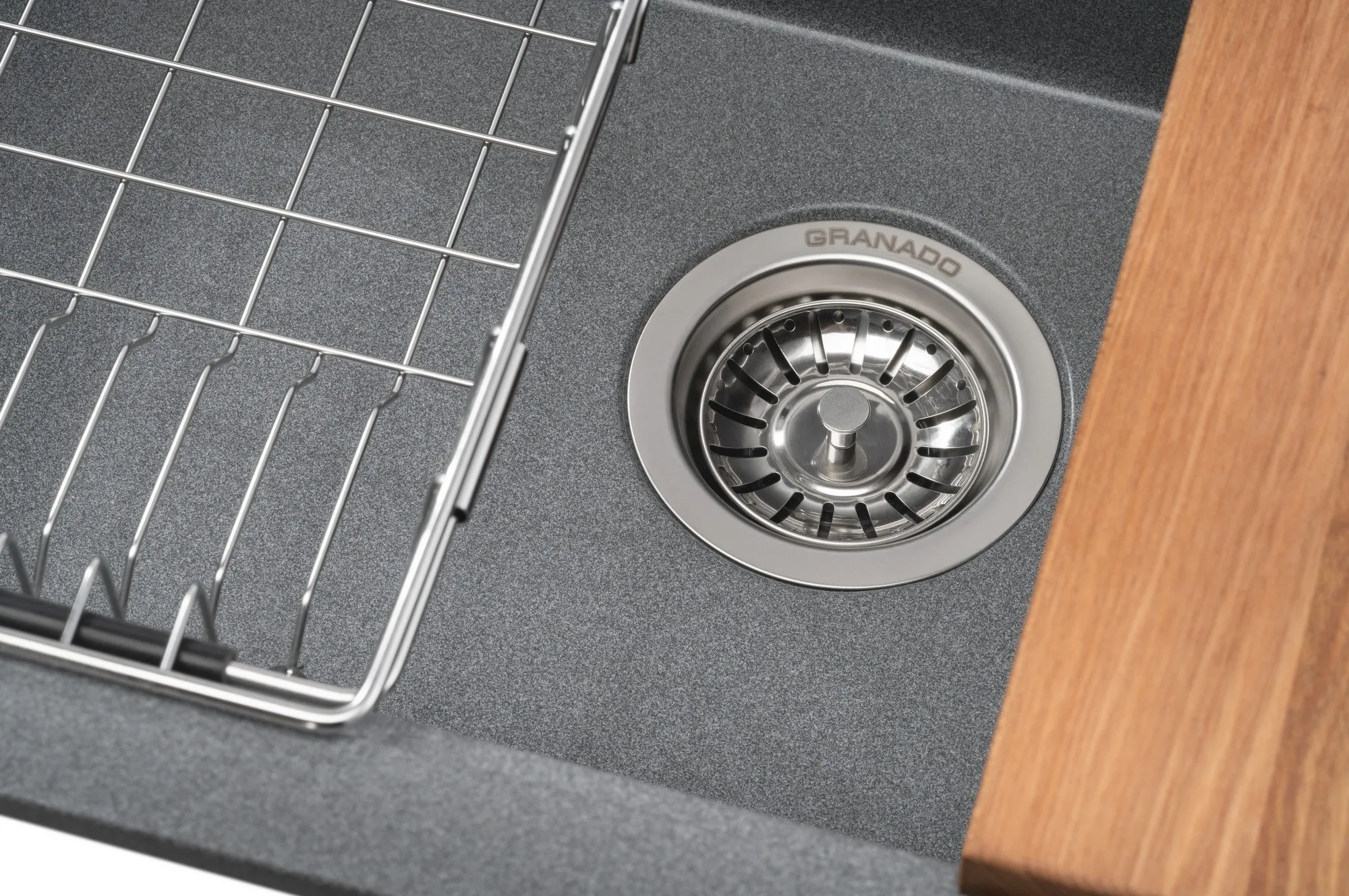 Мийка GRANADO Artes, виготовлена з німецького кварциту за технологією Nanogranite, відрізняється високою міцністю, антибактеріальними властивостями та стійкістю до ультрафіолету. Змішувач GRANADO Campo LUX із аератором Neoperl та керамічним картриджем Sedal забезпечує довговічність і комфорт у користуванні, а його висувний вилив дозволяє легко мити овочі чи посуд у місткому кошику.
