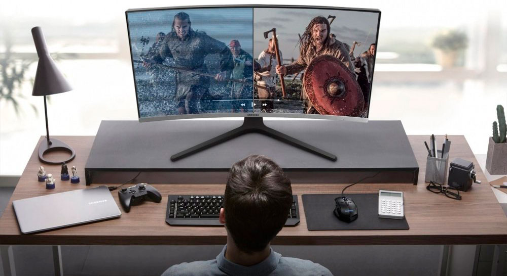 Вигнутий екран монітора покликаний змінити ваші уявлення про перегляд розважального контенту або роботі. Завдяки його вигнутій матриці створюється ширше поле зору, через що його екран здається більшим, ніж екран плаского монітора аналогічної діагоналі. Краї вигнутого екрана знаходяться ближче до очей користувача, завдяки чому вдалося знизити напруження на очі, тому що їм простіше перефокусуватися від центру до країв зображення.