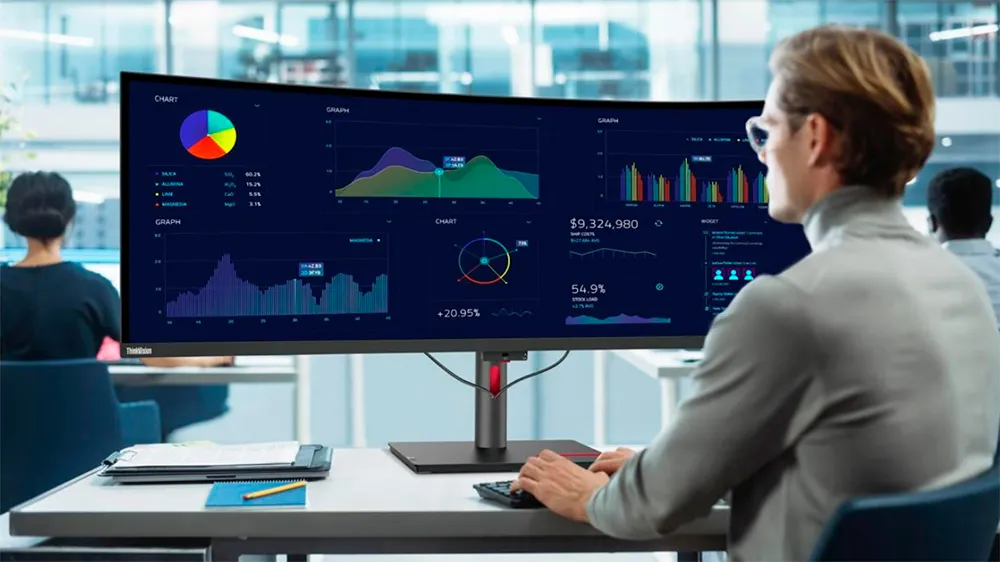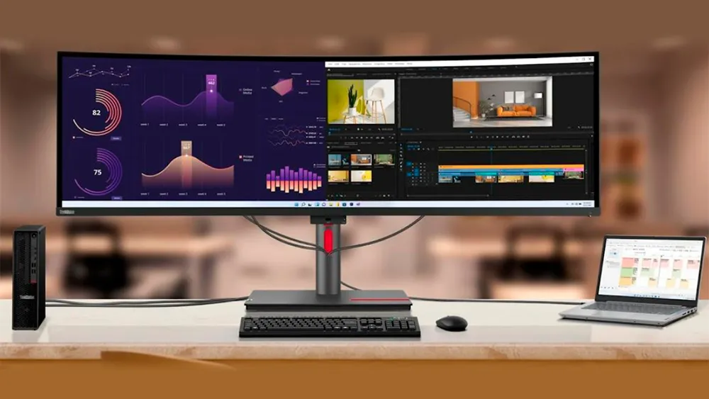 Надширокий монітор ThinkVision P49w-30, виконаний в елегантному чорному кольорі Raven Black з тонкими бічними рамками товщиною 2,1 мм, забезпечує сучасний і захоплюючий перегляд.