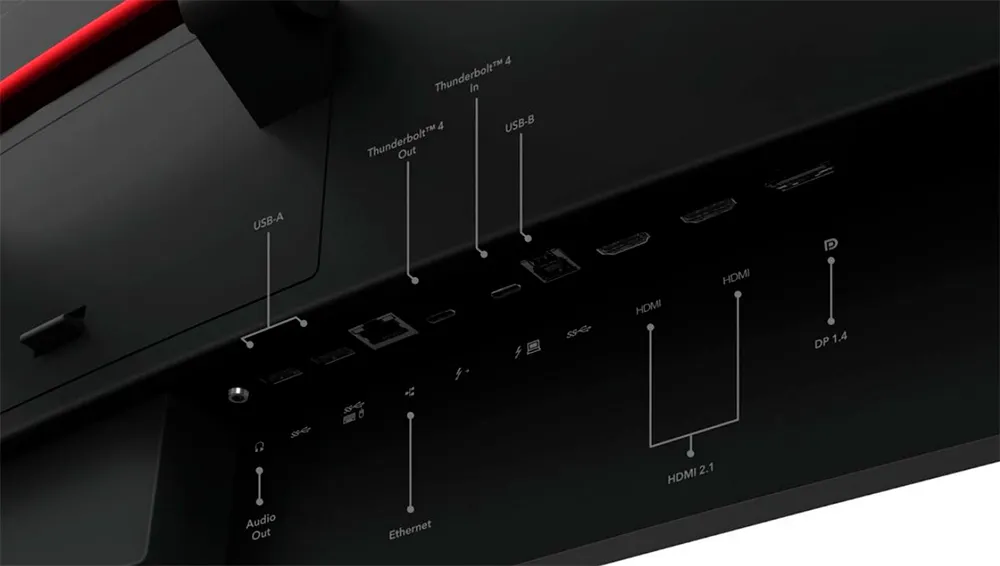 Монітор оснащений численними можливостями підключення, включаючи чотири порти USB 3.2 Gen 1, один порт USB-C® 3.2 Gen 1 і один порт USB-B 3.2 Gen 1. Для відображення високоякісного відео використовуйте два порти HDMI® 2.1, порт DP 1.4 або Thunderbolt™ 4. Порт Ethernet RJ45 забезпечує швидке підключення до мережі, дозволяючи завжди залишатися на зв'язку.