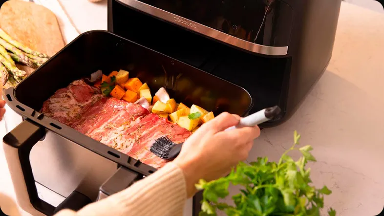 Оберіть на панелі керування одне відділення кошика або весь кошик. Після цього можна встановлювати нагрів, в діапазоні від 80 до 200 градусів. Максимальна температура підійде для приготування стейка чи замороженої картоплі фрі. Для випічки та овочів — достатньо 160-170 градусів. Щоб підрум'янити лаваш з начинкою чи розігріти приготовані страви за 10 хвилин, вмикайте нагрів на 100-140 градусів.