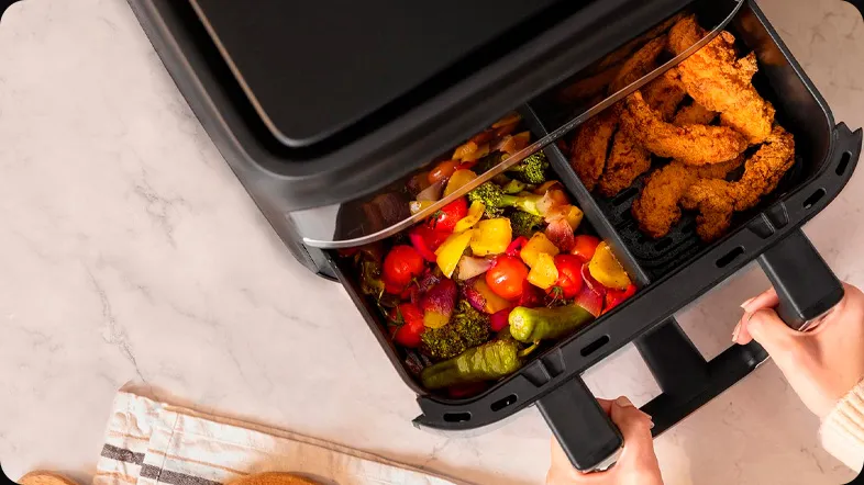 Звичайні аерофритюрниці підходять для приготування однієї страви, хоча ви можете міксувати різні овочі або запікати м’ясо з гарніром. З Cecofry Dual 9000 ще простіше — запікання основної страви та десертів не потребує розділення. Якщо ви хочете одночасно приготувати шматочки курки та солодку випічку, просто покладіть їх у різні відсіки. Вставна металева перегородка розділяє 9-літрову ємність на 2 менші секції по 4,5 літри. Так смаки та запахи різних страв не змішуються між собою.
