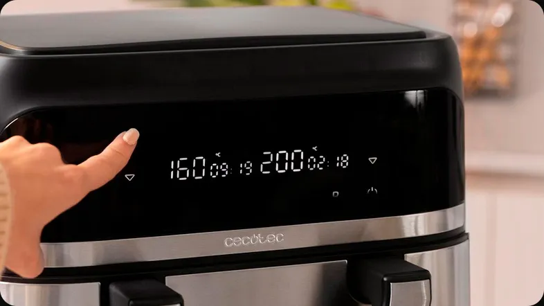 Замість звичних кнопок у CECOTEC — тактильно приємна сенсорна панель. Ви можете одним дотиком обирати нагрів або час приготування, а також керувати режимами. Мультипіч також має функцію синхронізації. Якщо першу страву потрібно запікати 10 хвилин, а другу — 20 хвилин, то приготування першої розпочнеться пізніше. В результаті продукти в обох кошиках зготуються одночасно.