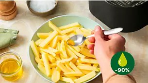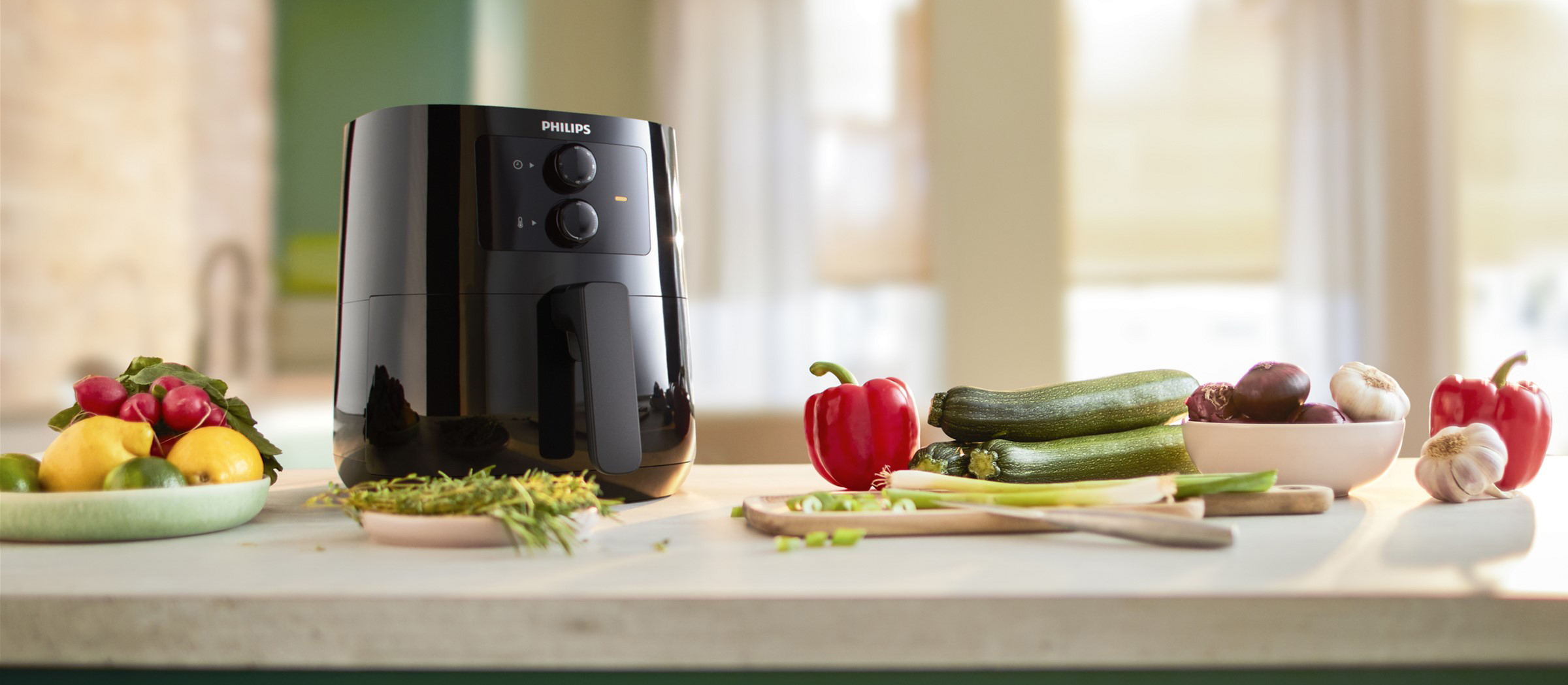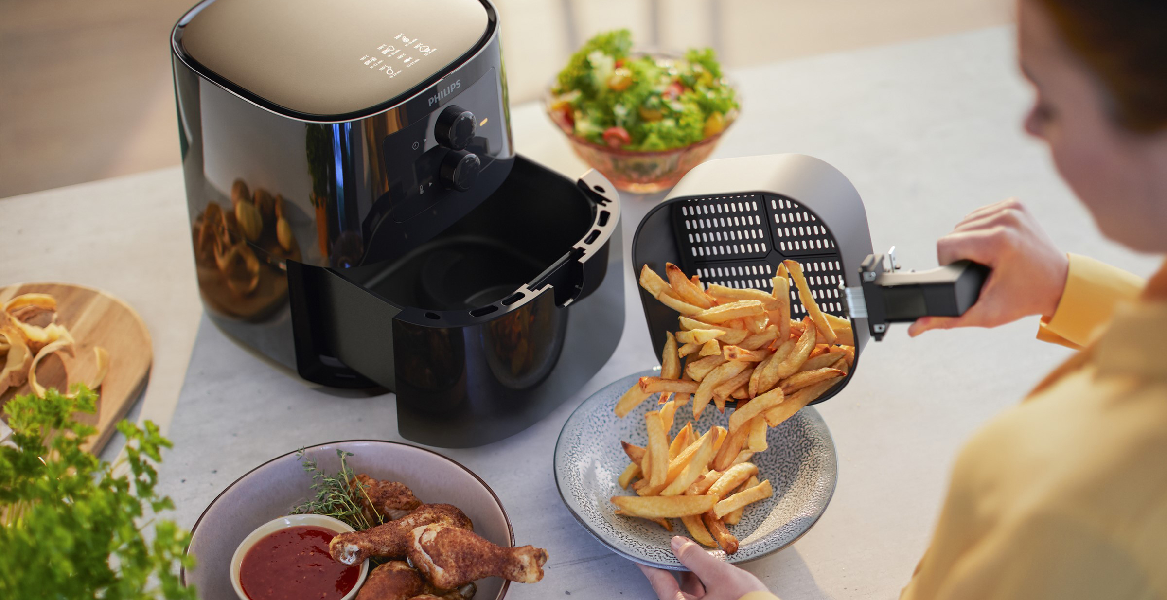 Аерогриль Philips Essential використовує гаряче повітря для приготування ваших улюблених страв із хрусткою скоринкою, забезпечуючи на 90 % менше жиру. Philips — провідний у світі виробник техніки для нежирних страв.