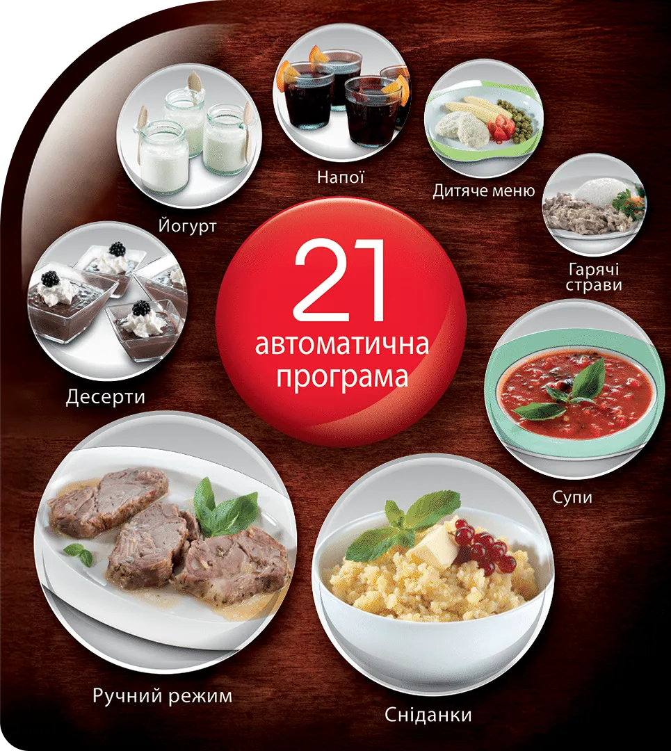 Покладіть інгредієнти й увімкніть пристрій. Мультиварка-скороварка має зручне, інтуїтивно зрозуміле меню і 21 програму автоматичного приготування. Те що треба, щоб на вашому столі завжди були смачні й корисні страви.
