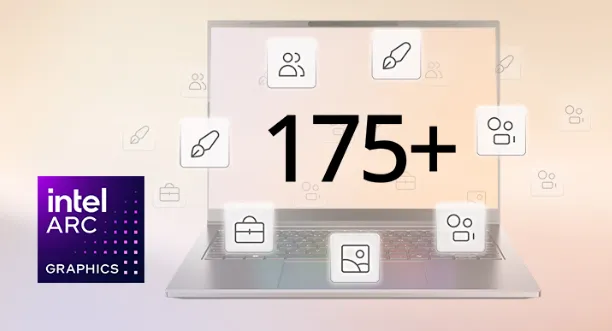 Розкрийте свій творчий потенціал завдяки вбудованому графічному процесору Intel® Arc™ з продуктивністю ШІ до 67 TOPS. Скористайтеся можливостями штучного інтелекту, зокрема масштабуванням в іграх для більш плавного ігрового процесу та прискорене редагування фото й відео, що дозволить вам втілювати свої ідеї в життя з неперевершеною швидкістю та точністю.