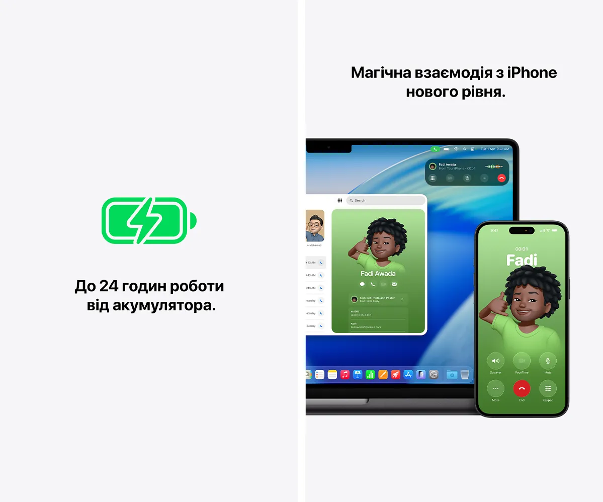 Mac має магічний зв’язок з іншими пристроями Apple. Переглядайте вміст на екрані iPhone та керуйте ним із комп’ютера Mac за допомогою функції «Дублювання iPhone».³ Копіюйте контент на iPhone і вставляйте його на Mac. Спілкуйтесь у Повідомленнях або телефонуйте чи відповідайте на виклики FaceTime на Mac.⁴
