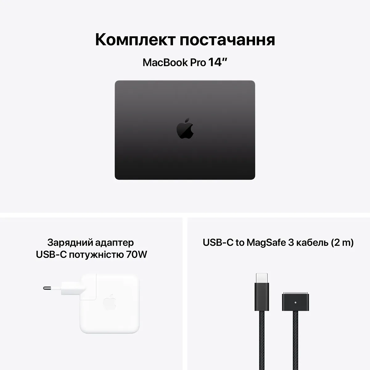 MacBook Pro оснащено трьома портами Thunderbolt 4 і зарядним портом MagSafe 3, слотом для SDXC-карт, портом HDMI та портом для навушників. А ще до нього можна підʼєднати до двох зовнішніх дисплеїв.
